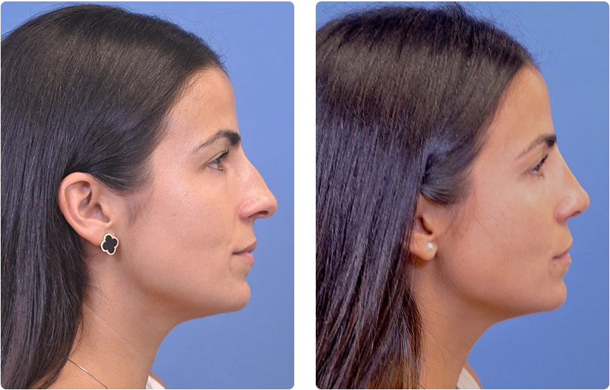 This female patient sought consultation because of a drooping nasal tip and dorsal hump.. Surgical correction was performed via an open approach. Correction of these concerns was performed via an open approach. Dorsal reduction, reconstitution of the midvault with autospreader flaps, placement of a septal extension graft with a tongue-in-groove maneuver with tip rotation and alar base resections were carried out.
